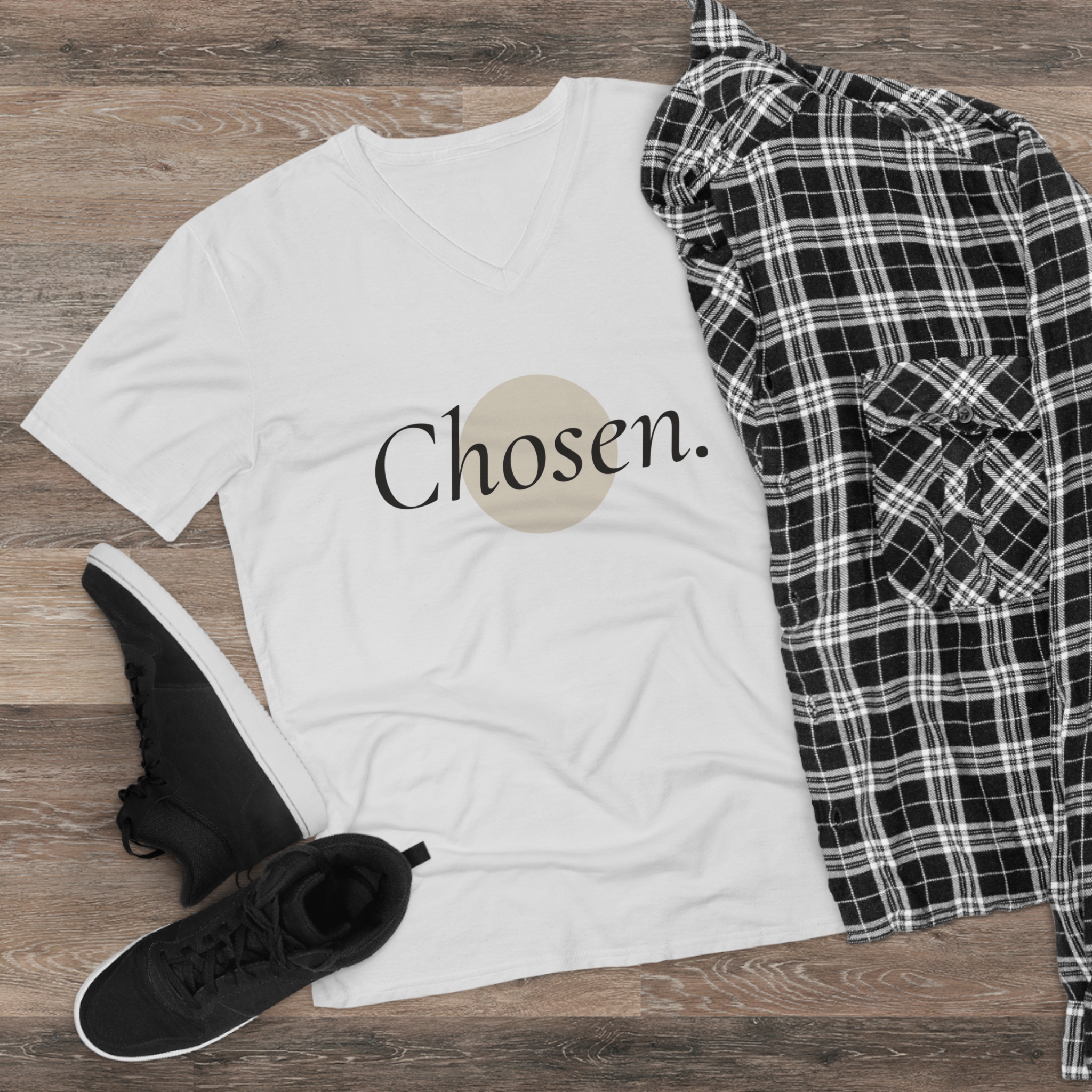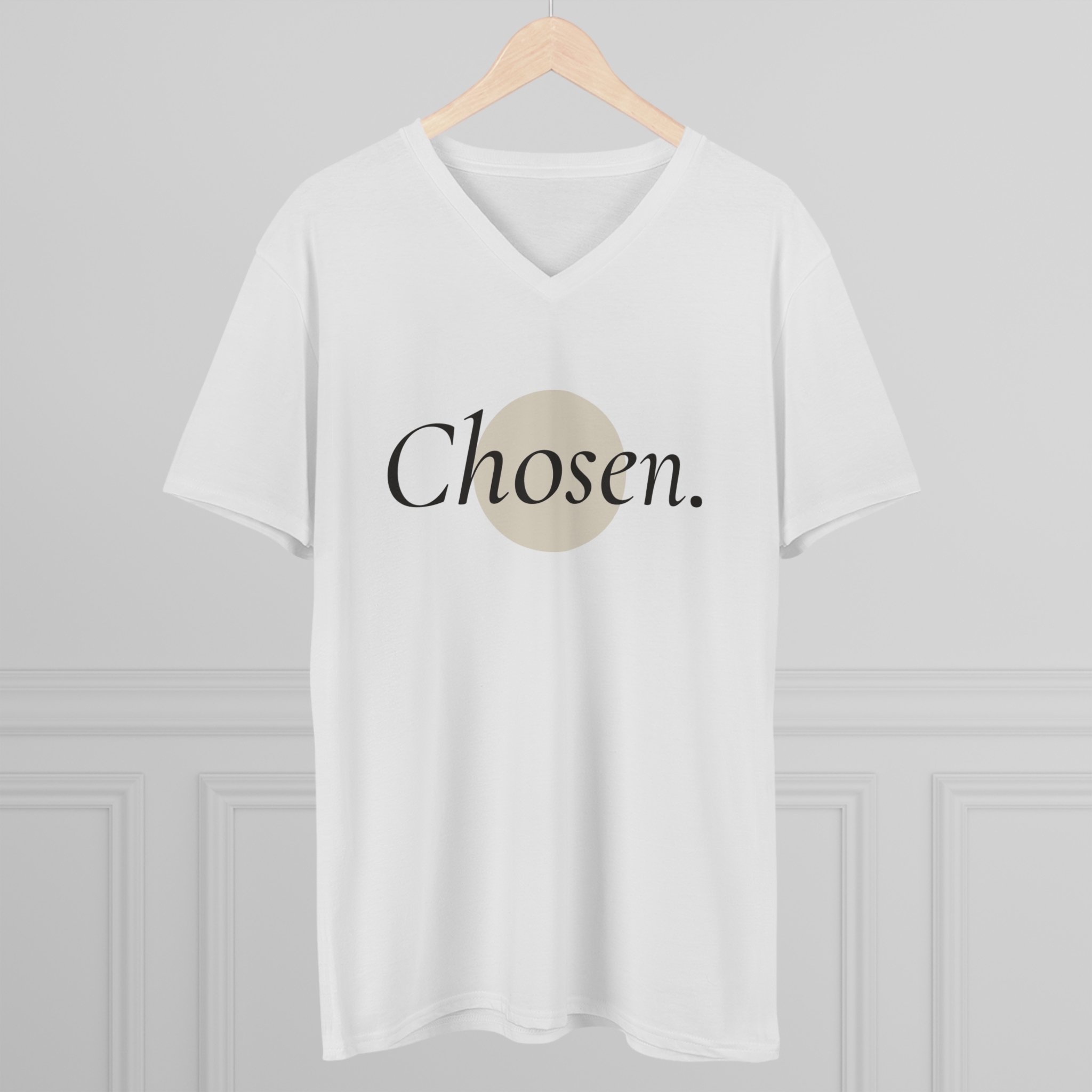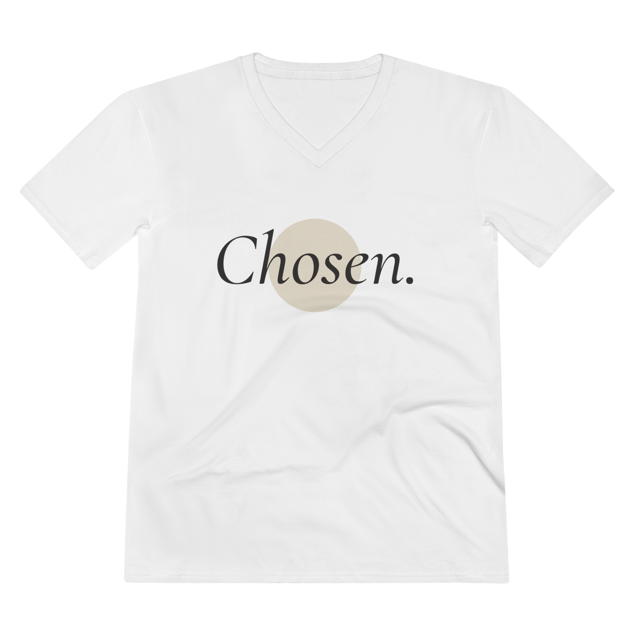 This lightweight V-neck tee quietly declares belonging. A soft, airy fabric drapes easy over the shoulders, while a subtle, minimalist print centers a single word—Chosen.—inside a warm, muted circle. Wear it as a daily affirmation; let the understated design speak during slow mornings, coffee runs, or gentle evenings with friends. The semi-fitted cut and ribbed V-neck keep the silhouette tidy without feeling tight, and the tear-away label means no scratchy interruptions. It’s for people who favor calm confidence and small, intentional statements in their wardrobe.