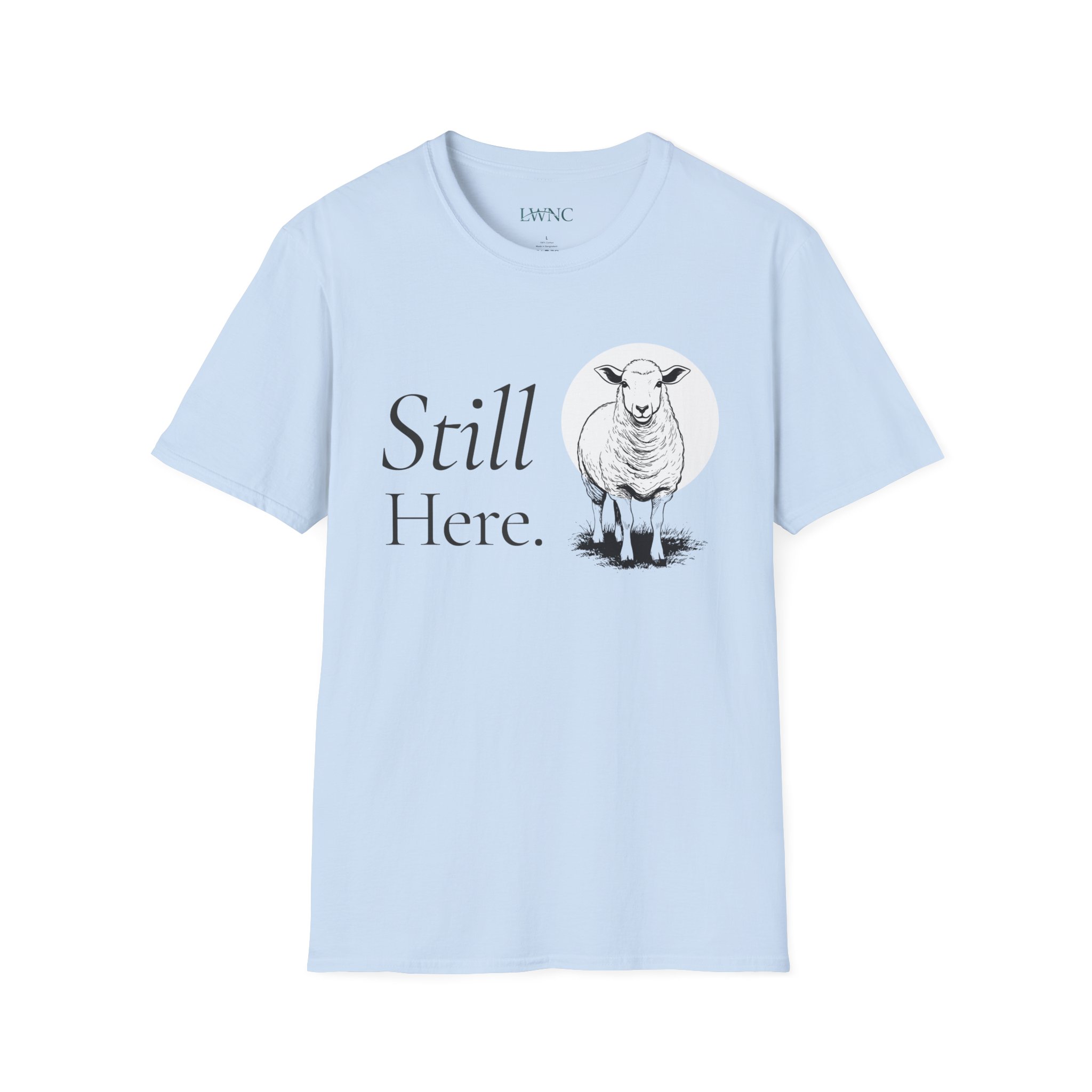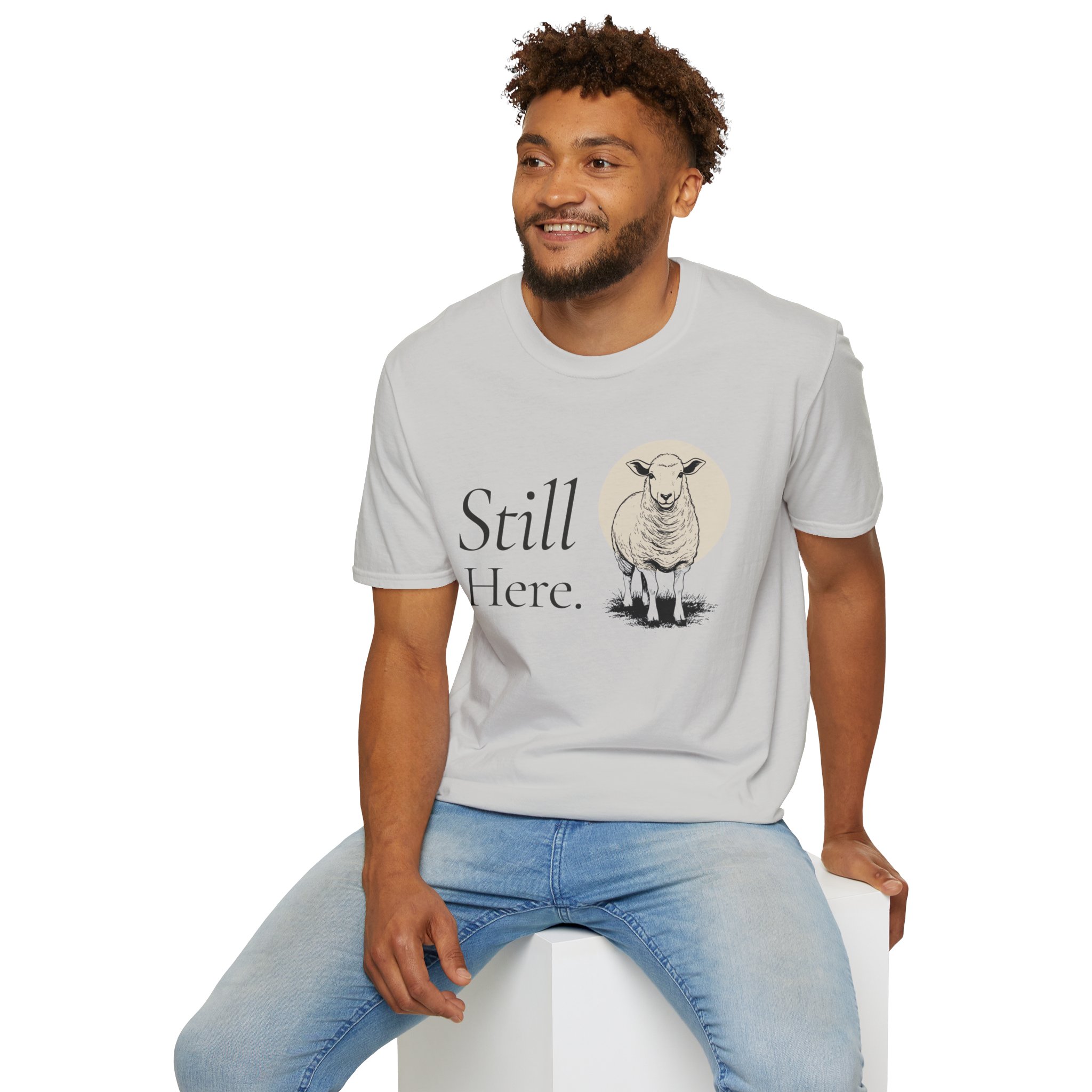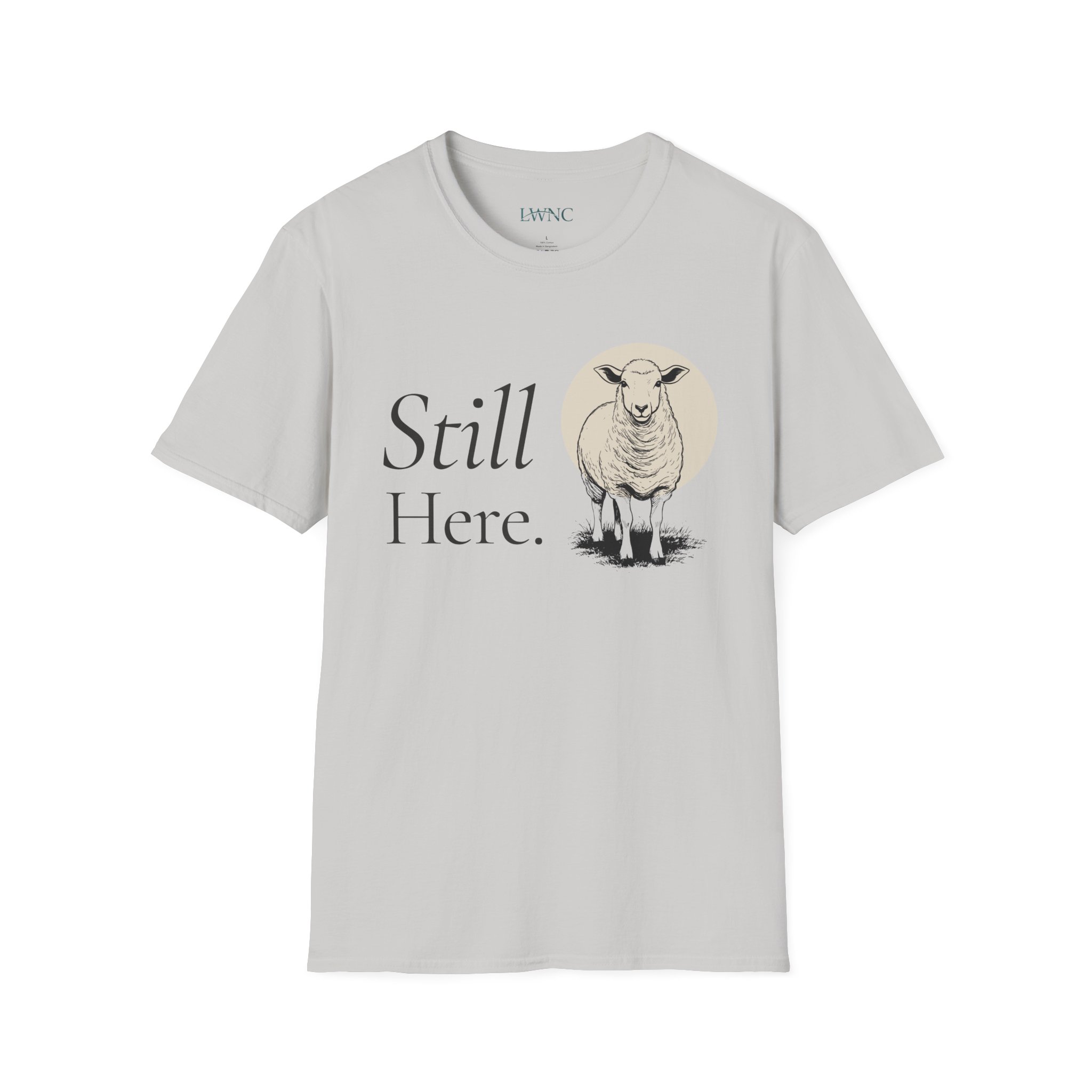 Soft, quiet, and a little wise — this tee carries a calm presence. A gentle sheep illustration stands beneath the words “Still Here.”, a small declaration of endurance and gentle resilience. Wear it on slow mornings with coffee, layered under a cardigan for evenings by the fire, or on walks when you want your outfit to whisper rather than shout. The lightweight ring-spun cotton feels breathable against the skin and drapes cleanly for an easy, lived-in look. Subtle natural tones and minimalist typography keep the message simple: a quiet reminder that you remain, steady and unhurried.